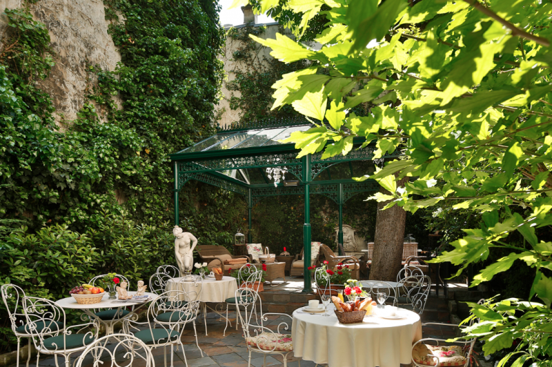 Hotel des Marronniers is located in the heart of Saint-Germain-des-Prés, in the rue Jacob. Entering the entrance courtyard, you discover the hotel, unsuspected from the street, then passing the door, it is a particularly warm welcoming that awaits you. A question about Paris, a restaurant, or an itinerary? Our team will have the answer, or will find it! Finally, at the back, a bucolic garden and its two large chestnut trees make you forget the urban life outside. Breakfast, tea or a glass of wine in the garden, a moment that is always very appreciated by our hosts and by the locals. The tea room and bar close at 11:30 p.m. to keep the place peaceful.